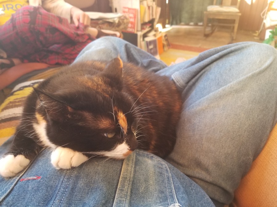 an animal high in a tree; alert, observant, and undiscovered.